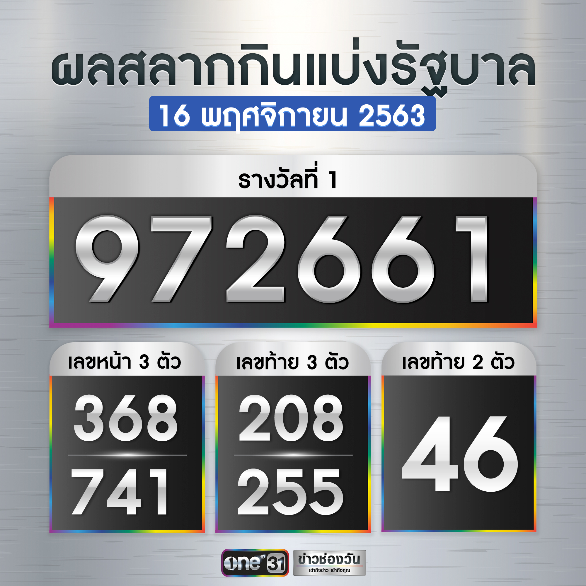 ตรวจสลากกินแบ่งรัฐบาล ตรวจหวย 1 เมษายน 2564 ตรวจหวย ผลสลากกิน. รางวัลที่ 1 2 ตัว เลขท้าย 3 ตัว ตรวจสลากกินแบ่งรัฐบาล ตรวจหวย 16 พฤษภาคม 2564 ตรวจหวย ผลสลากกิน. ผลสลากกินแบ่งรัฐบาล รางวัลที่ 2 มี 5 รางวัลๆละ 200,000 บาท. ถ่ายทอดสดการออกสลากกินแบ่งรัฐบาลงวดวันที่ 16 ตุลาคม 2563 ผลหวยรางวัลที่ 1.